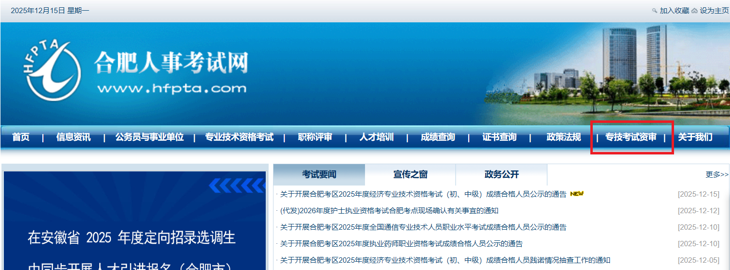 1、登录合肥人事考试网(www.hfpta.com)点击“专技考试资审”栏目(如附图1)。